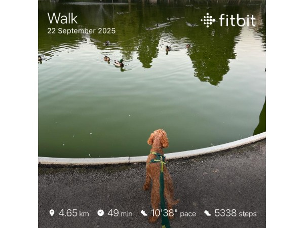 We covered 4.65 km (about 2.89 miles) together. The weather was just right for an evening stroll, and the park felt lively with the sound of ducks and the whir of scooter wheels. Tula was in her element, darting ahead and circling back, while I enjoyed the peacefulness of the water and the company of my two favorite walking buddies.
